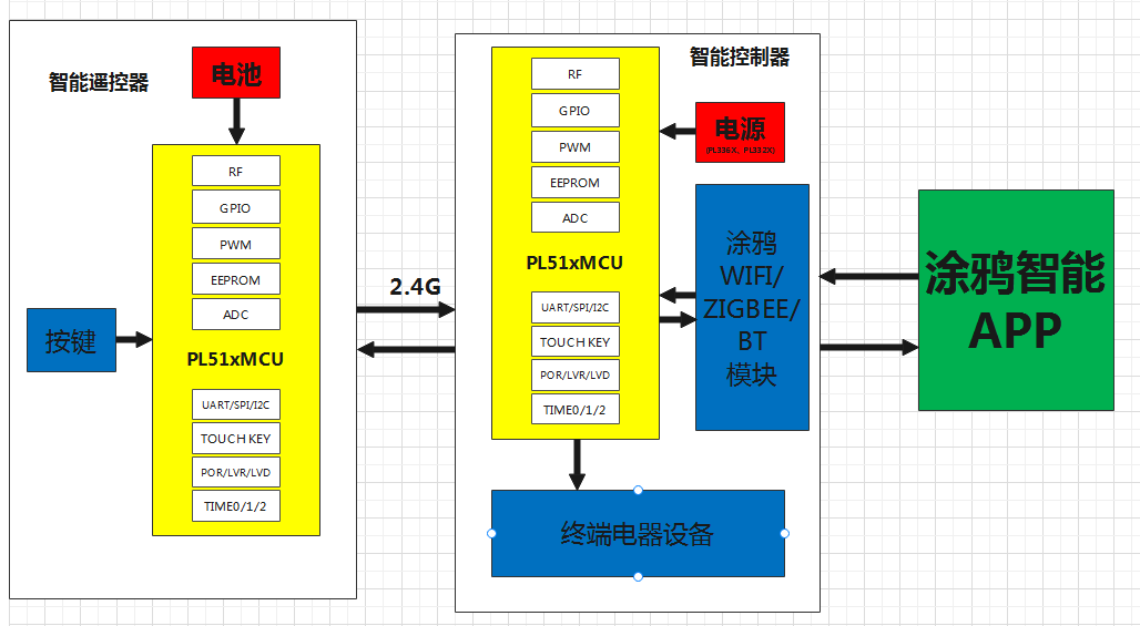 目前市場(chǎng)終端設(shè)備產(chǎn)品實(shí)現(xiàn)人機(jī)互聯(lián)互通方式多樣,功能需求個(gè)性化定制越來(lái)越多,使用PL51WT003/PL51WT140結(jié)合涂鴉WiFi、ZigBee、Bluetooth聯(lián)網(wǎng)模塊,實(shí)現(xiàn)設(shè)備通過(guò)APP與云端通信,同時(shí)解決終端設(shè)備產(chǎn)品功能需求個(gè)性化定制,本地場(chǎng)景離線模式互聯(lián)互通,自組網(wǎng)控制,解決多產(chǎn)品控制不一致等問(wèn)題,使得終端設(shè)備單品在實(shí)現(xiàn)互聯(lián)互通上具有最佳解決方案。